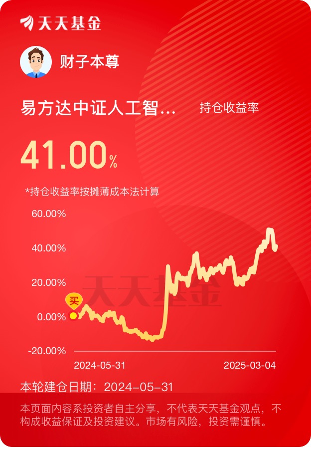 我是2024年5月底买入的易方达中证人工智能主题ETF联接A的,至今浮盈41%,