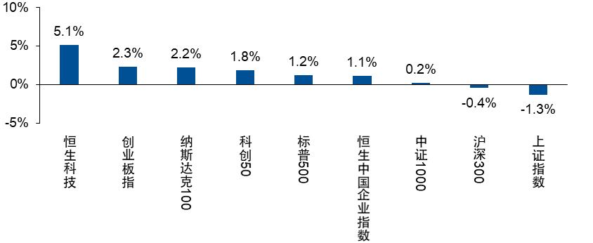 上周市场震荡回调,成长类资产相对占优。上周上证指数下跌1.30%,沪深300下跌0.44%,中证1000上涨0.21%。风格方面,成长风格相对占优。行业结构层面,上周煤炭、电力设备、电子等涨幅靠前;银行、有色、非银等表现较弱。