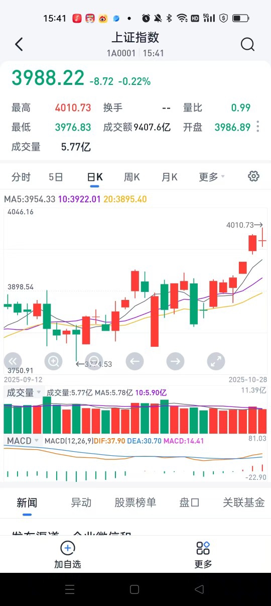 从昨天的盘面来看,4000点被捅破过,但是又回落了,市场显得比较谨慎,成交量也比周一小了些,同时大部分个股也是翻绿的。