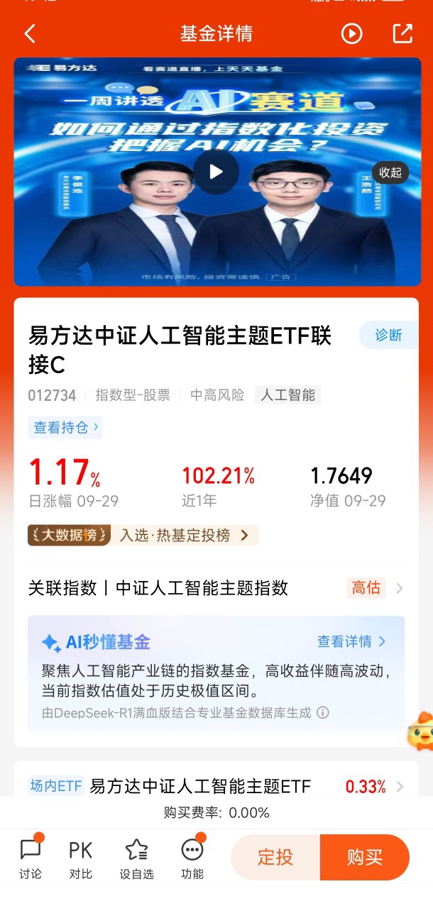 第三,流动性充裕,交易便捷。截至2025年9月22日,易方达中证人工智能ETF近20个交易日累计成交金额358.24亿元,日均成交金额17.91亿元;今年以来,177个交易日累计成交金额1331.76亿元,日均成交金额7.52亿元 。高流动性意味着投资者可以轻松地进行申购赎回操作,不会因规模问题影响交易决策。