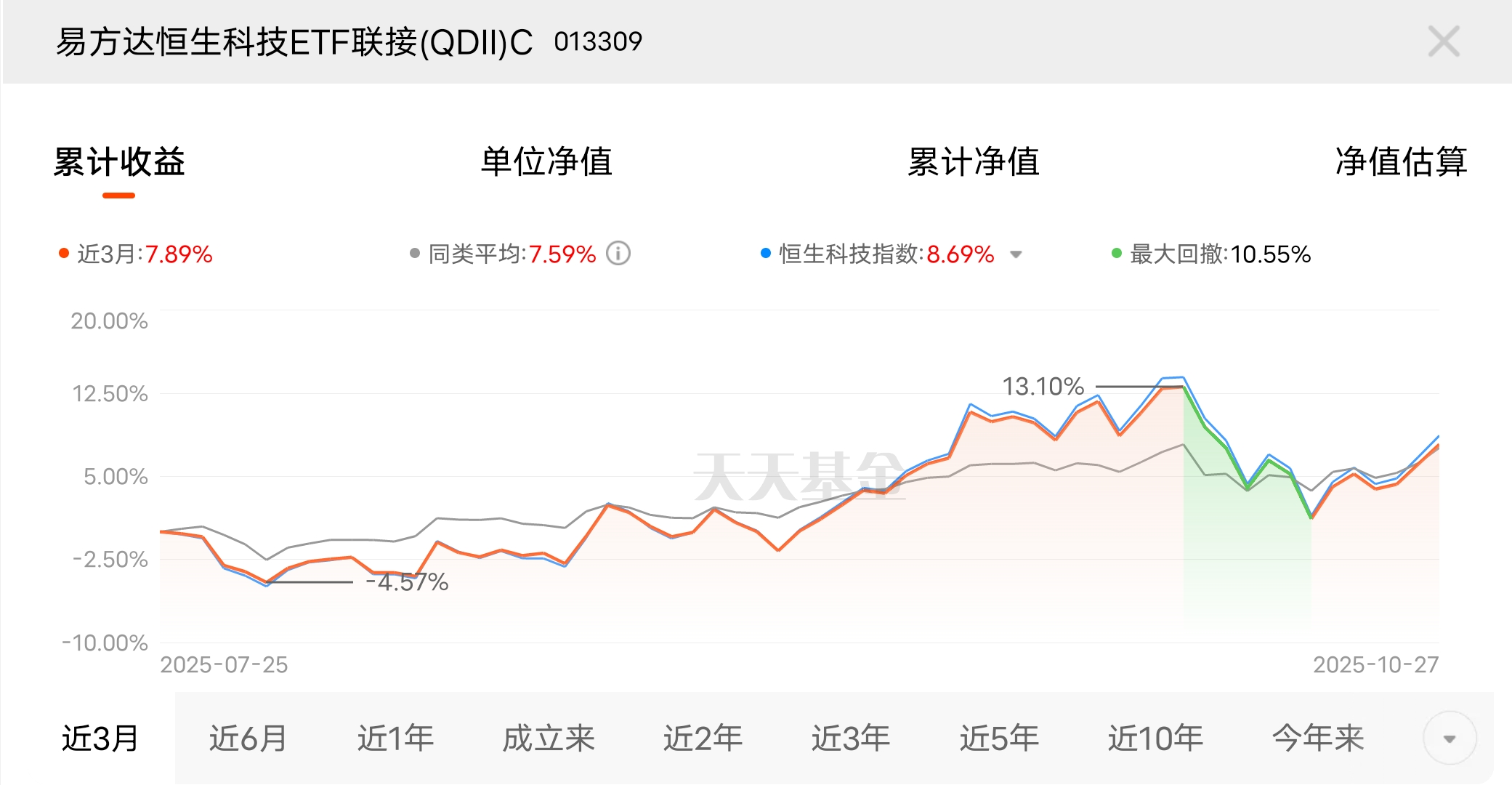 恒生科技里的互联网龙头业绩慢慢改善,估值也在修复,机会越来越清晰。易方达恒生科技ETF联接(QDII)C近3个月涨了7.89%,能分享到修复红利。
