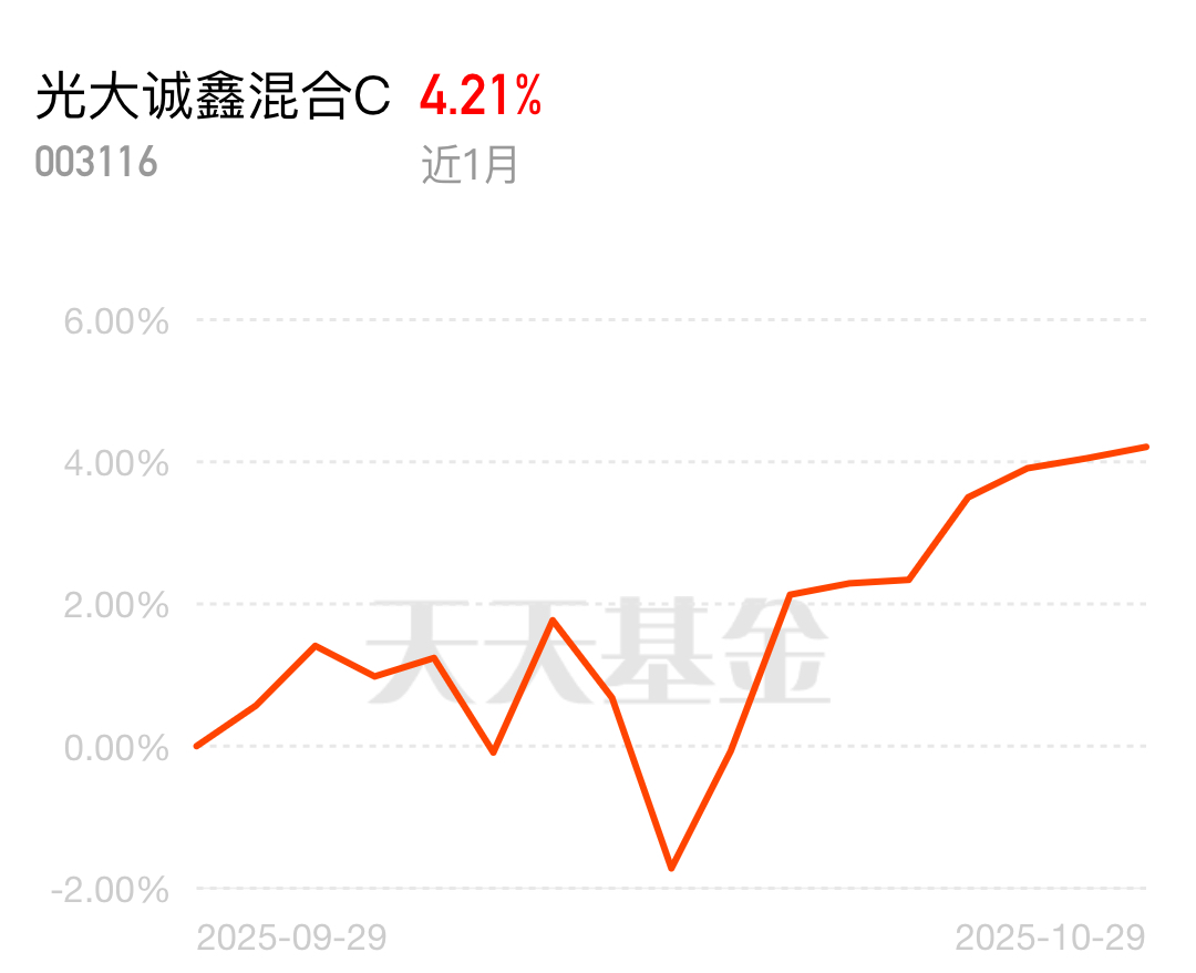 都说现在是布局优质基金的好时候,尤其是那些业绩实打实的产品。光大诚鑫混合C就很靠谱,1个月业绩有4.21%,短期收益看得着。$光大诚鑫混合C$