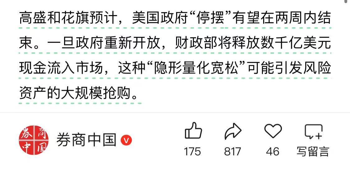 不过也不用慌,截至今天他们已经停摆了35天,追平了历史最长停摆记录。从预期来看,11月中旬结束本轮停摆的预期还是比较高的。
