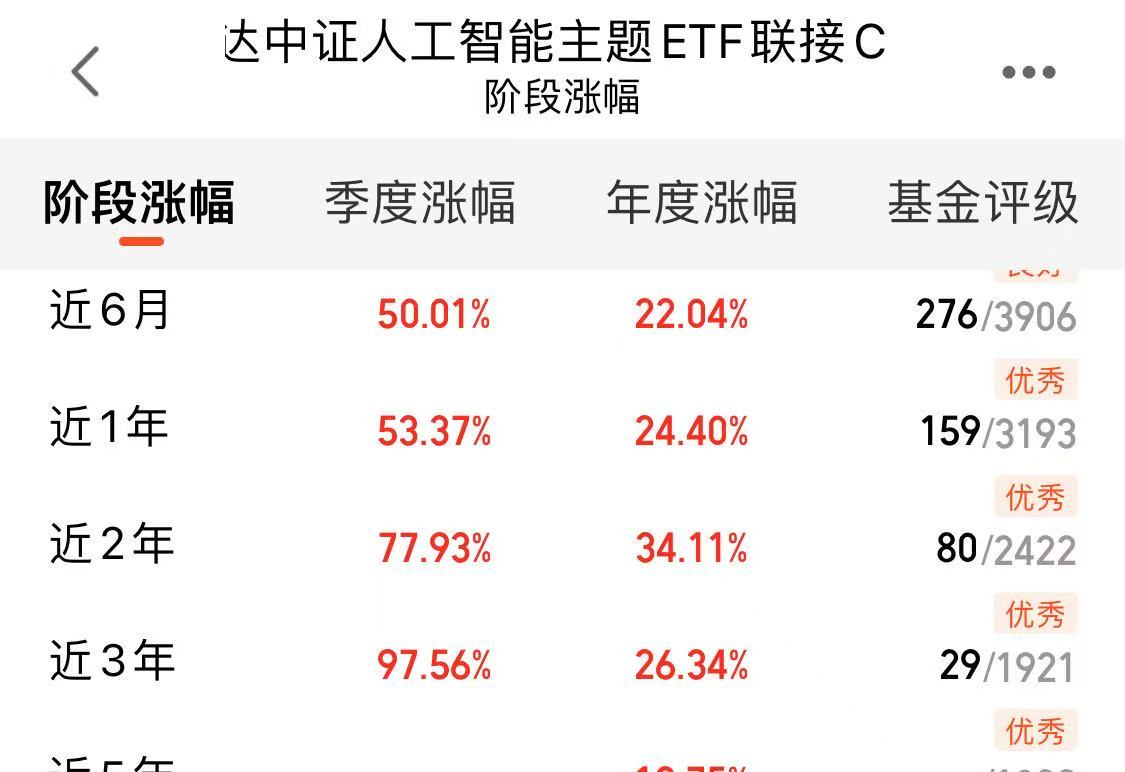 人工智能这只产品中长期业绩表现还是很出色的,尤其科技板块行情来的时候,细分行业轮动很快,包括CPO、芯片、机器人等轮流上涨,但每次人工智能指数都能跟着吃肉。