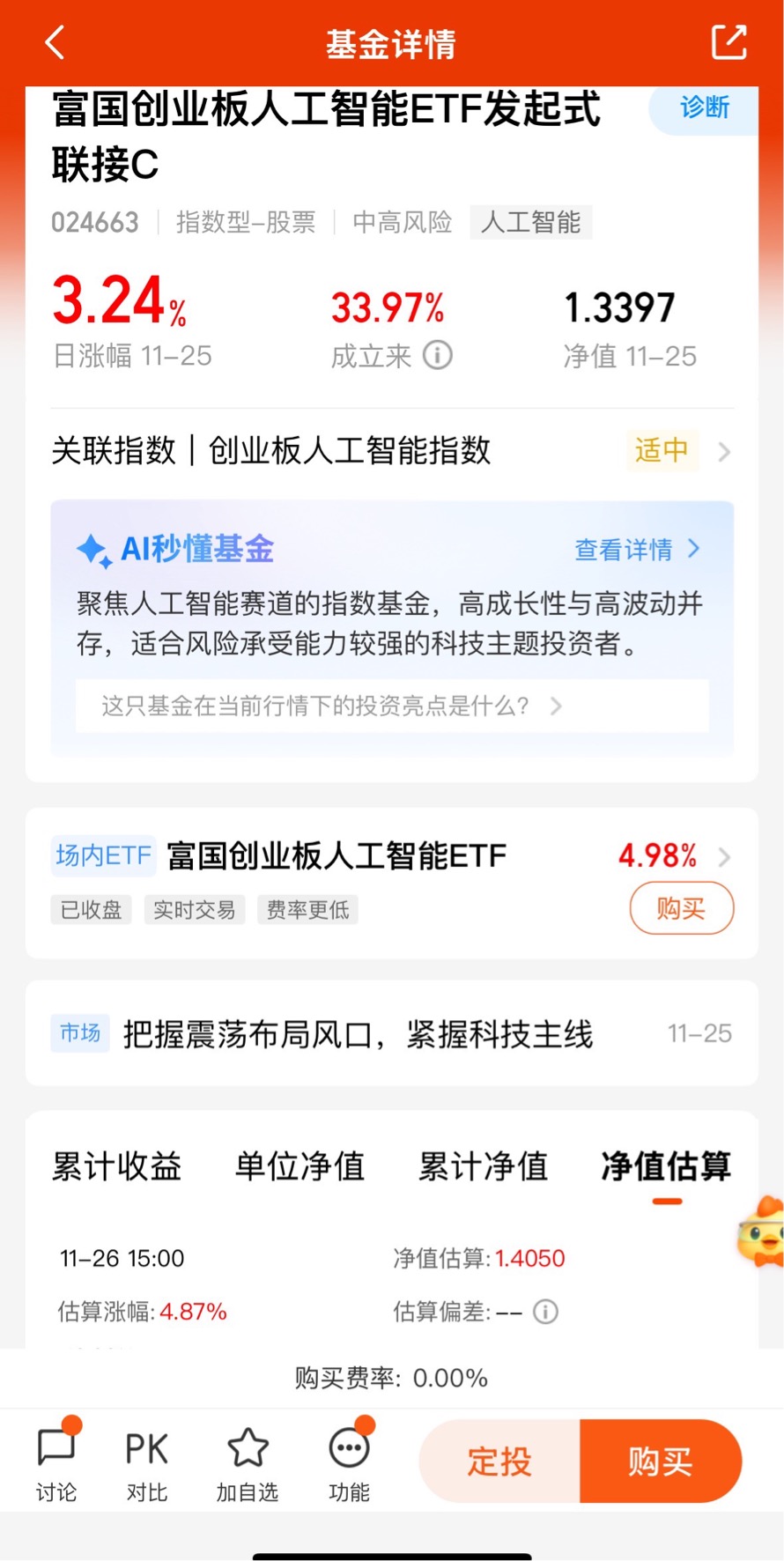 科技方向还是妥妥的涨,今天涨幅比昨天还猛,$富国创业板人工智能ETF发起式联接C