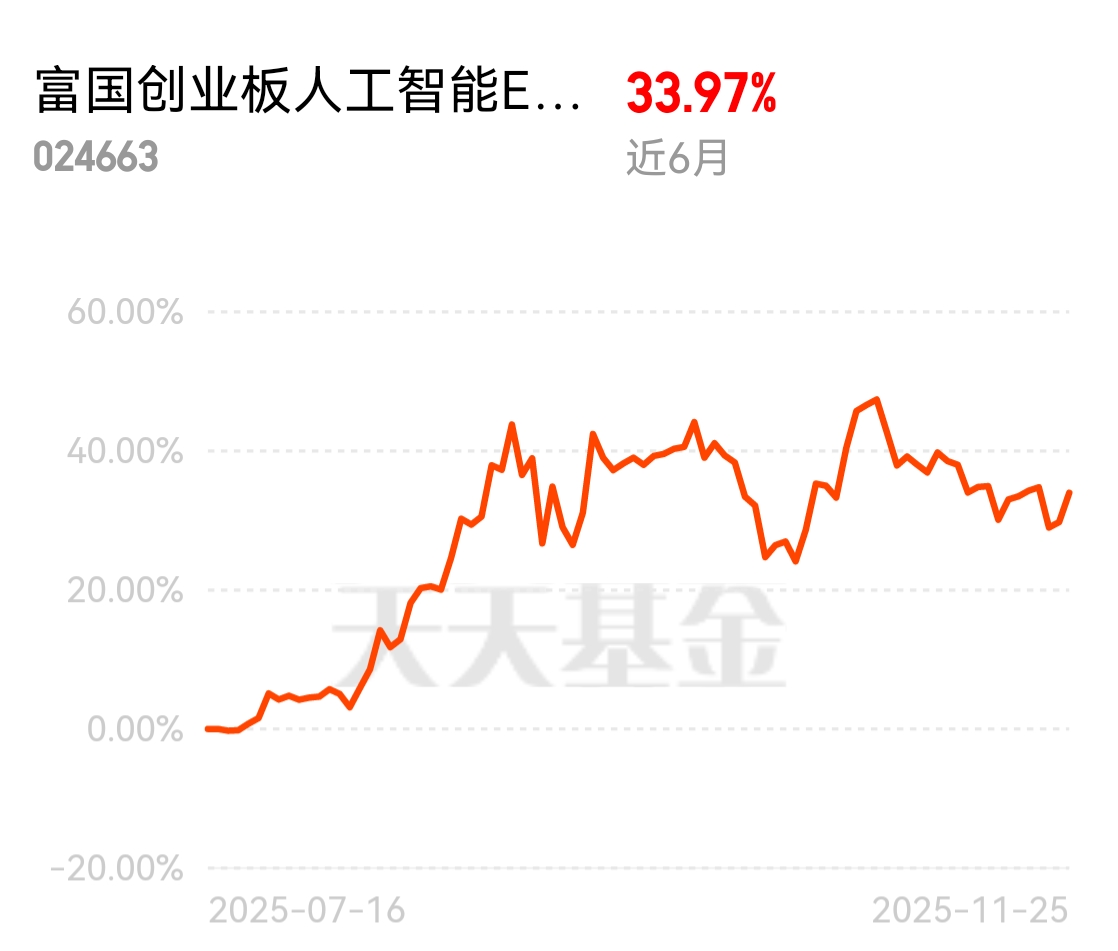这阵子也配置易方达那只AI联接C,但发现富国创业板人工智能ETF联接C弹性更足今天成果非常亮眼,预估涨幅超5%。AI应用端持续爆发,谷歌Gemini 3 Pro多榜领先,阿里千问、蚂蚁灵光用户涨得快;叠加中美风险偏好回升,A股算力链受益明显。近6个月涨了34%,超越大多数同类,估值比过去五年41%的时间还低。今天表现非常亮眼,预估涨幅超5%,逢调整配置的思路依然靠谱。