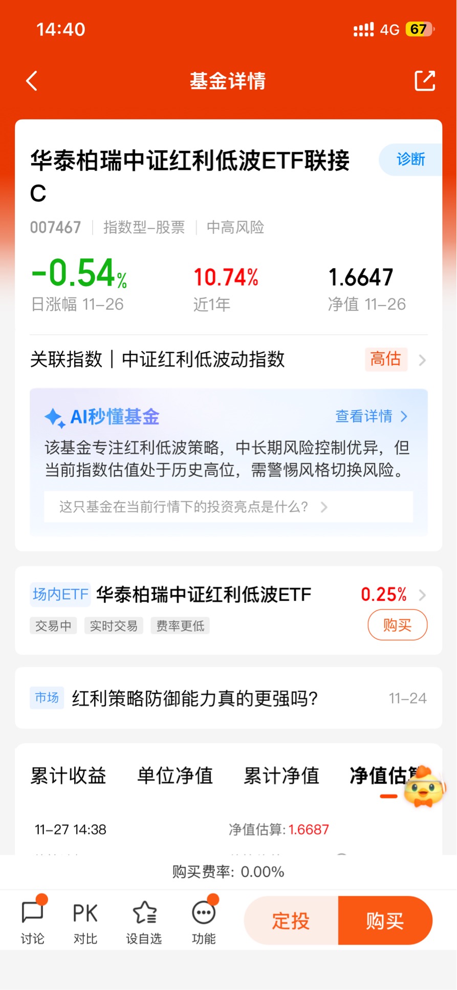 今天红利低波行情有点“蔫儿”,昨天日涨幅跌了0.54%,不过近一年10.74%的收益也算扛住了大环境。这种行情下,我更愿意选华泰柏瑞这种“稳字当头”的——它专做红利低波,说白了就是挑那些分红多、波动小的票,不用跟着市场上蹿下跳。就是现在指数估值有点高,得留个心眼,但要是你想求个“不折腾的收益”,这只的风控能力是真的不错。$华泰柏瑞中证红利低波ETF联接C$ #3800点的A股值得加仓吗?#