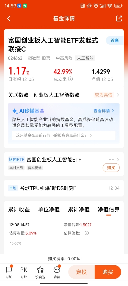 产业景气度持续拉满,盈利兑现力超预期:AI产业盈利加速兑现,富国创业板人工智能$富国创业板人工智能ETF发起式联接C$ 估值上涨5.09%,