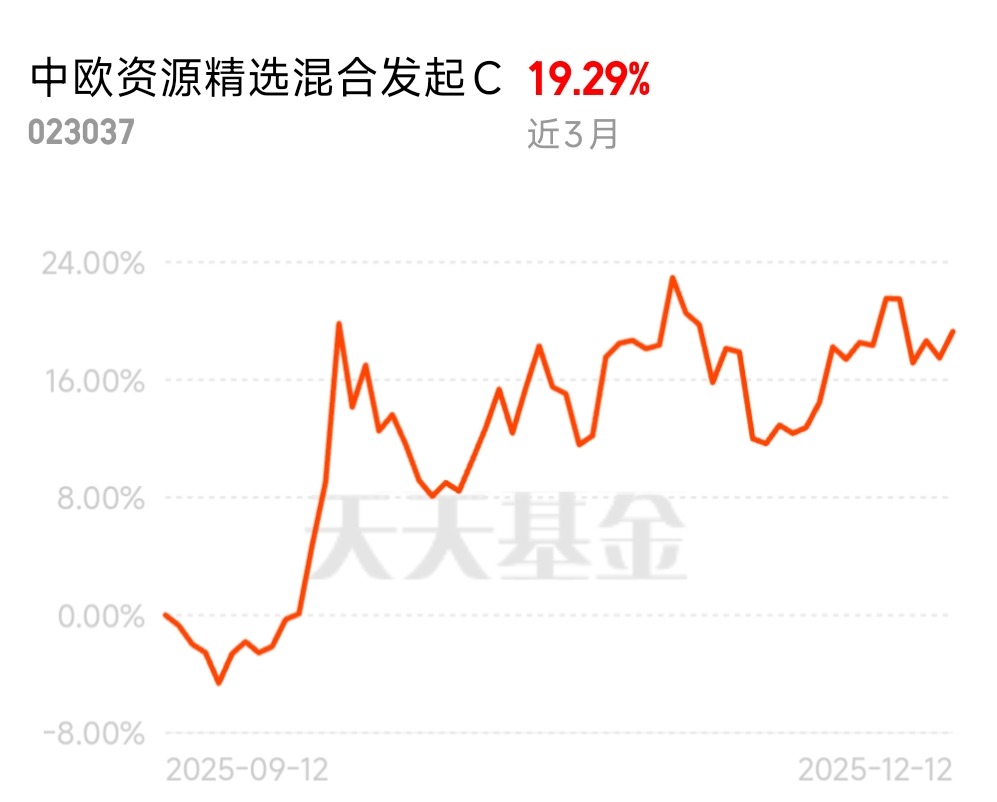 市场流动性宽松预期强化,资源板块成资金香饽饽,情绪和资金双支撑。中欧资源精选混合发起 C 近 3 月 19.29%,短期配置灵活,小资金也能参与。$中欧资源精选混合发起C$