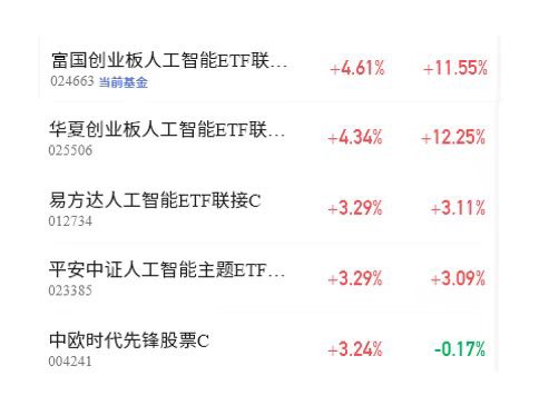 最近大盘波动比较大,但是科技反弹趋势还挺强的,尤其是创业板人工智能,$富国创业板人工智能ETF发起式联接C$ 今天估值上涨4.61%,华夏创业板人工智能ETF估值4.34%,易方达人工智能ETF联接C估值3.29%,平安中证人工智能主题ETF估值3.29%
