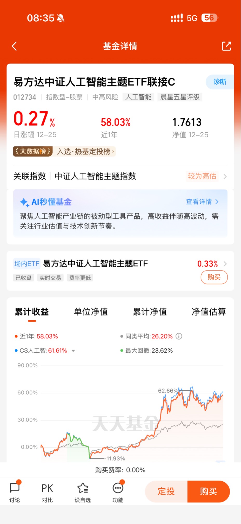 在三年多的投资路上,我做过最得意的事,不是精准抄底某只妖股,也不是抓住某次短期暴涨行情,而是坚持定投易方达中证人工智能主题ETF联接C(012734),用纪律和耐心换来了实实在在的回报。这段经历让我明白,普通人的投资胜利,从来不是靠运气,而是靠与优质赛道的长期同行。