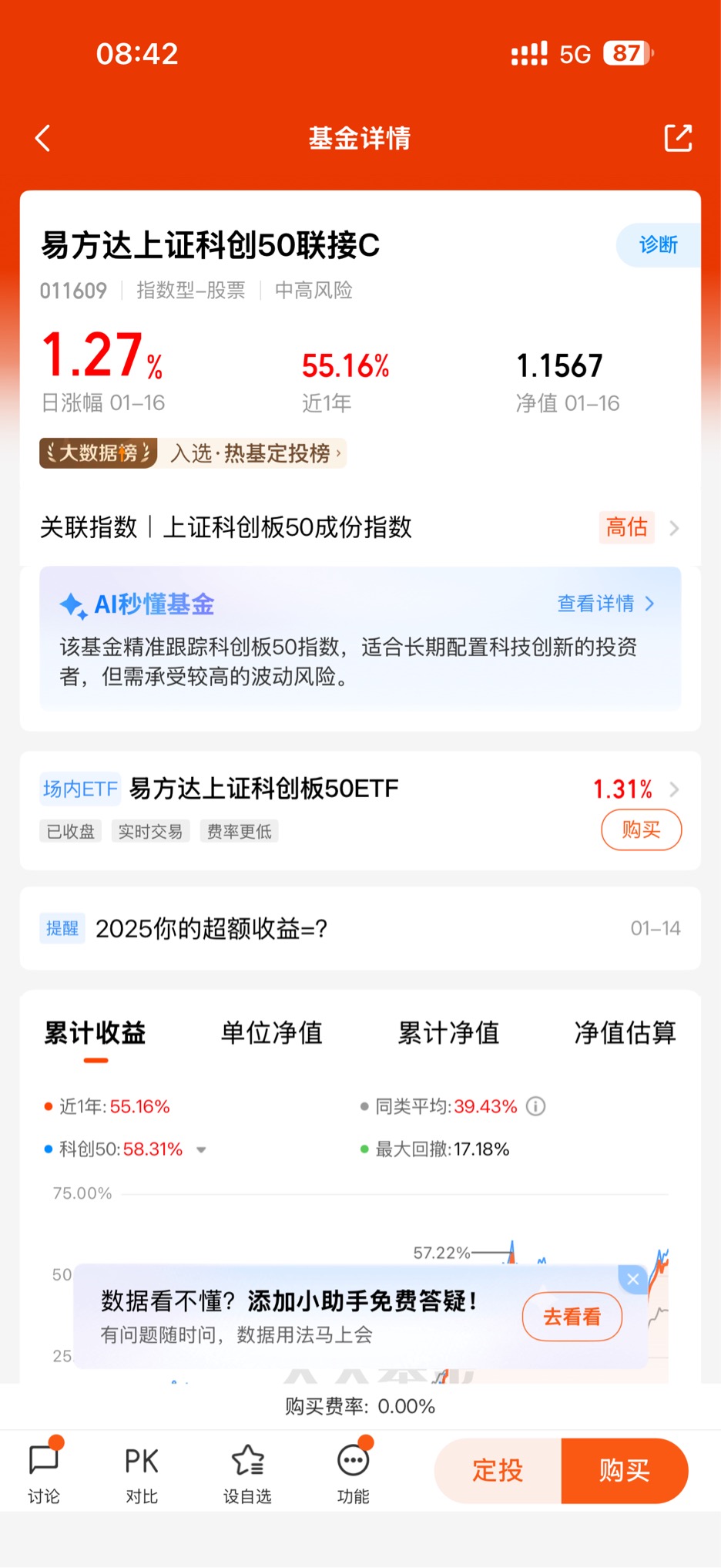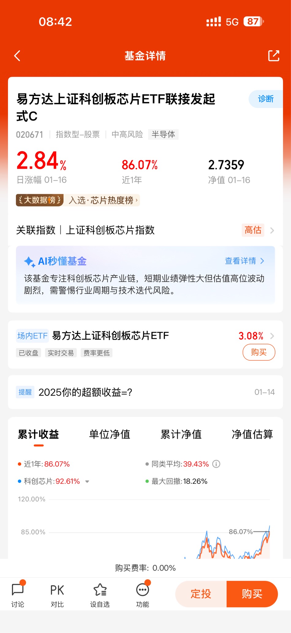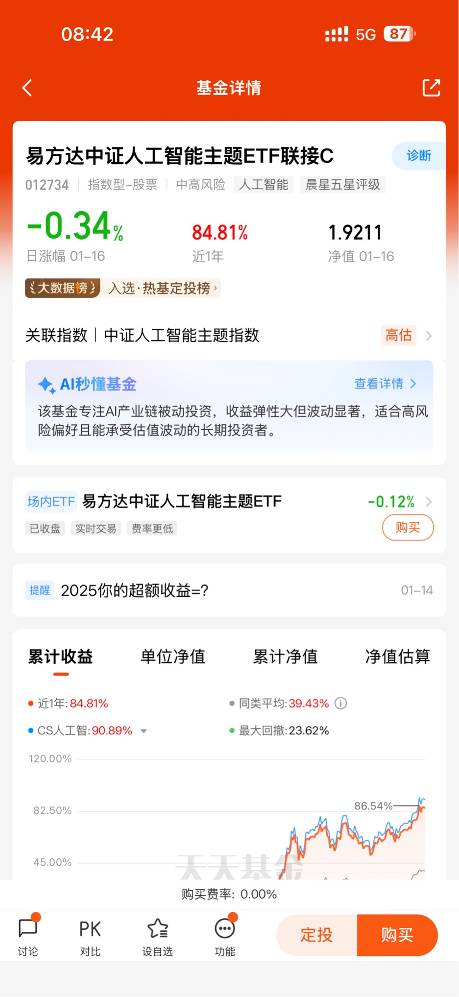 在三年多的基金投资生涯中,我尝试过追热点、抄底冷门赛道,也踩过不少坑,但最让我引以为傲的,还是2023年初开始定投易方达中证人工智能主题ETF联接C(012734)的决定。这笔坚持了两年的投资,如今已斩获近85%的收益,不仅让我的资产实现了质的飞跃,更让我读懂了“长期主义+优质赛道”的投资真谛。