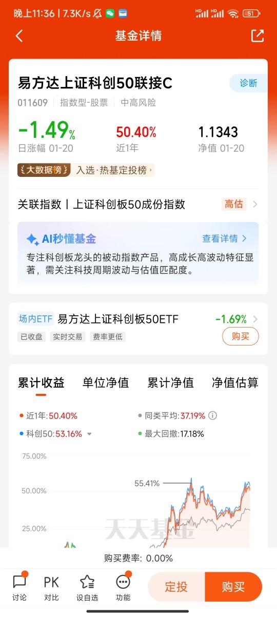 故事始于2025年三季度初。彼时,中证人工智能指数凭借成分股高达59.41%的归母净利润增速,叠加国产大模型与芯片的技术突破消息,走出了一波凌厉的上涨行情。易方达中证人工智能ETF联接C作为紧密跟踪该指数的产品,三季度单季回报高达54.18%,市场情绪空前高涨。身边不少投资者纷纷加仓入场,论坛里满是"AI大牛市"的乐观论调,甚至有观点认为板块将突破估值天花板持续走高。我在年初已小仓位布局这只基金,看着账户里不断增长的收益,再加上对智能算力未来五年46.2%复合增长率的美好预期,终于没能忍住追高的冲动。在9月中旬基金净值创下阶段性高点时,我一次性将仓位提升至总资金的40%,满心期待能搭乘AI浪潮再赚一笔。