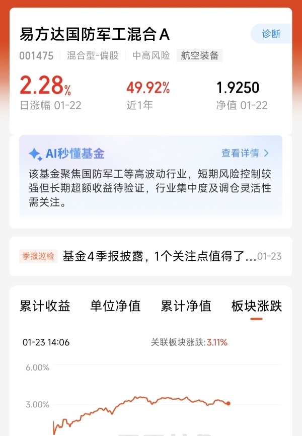 易方达国防军工混合这只主动的军工混合基金。聚焦国防军工的同时,还覆盖到了商业航天。昨天上涨了2.28%。今天的估值已经涨超三个点。长期的表现做到了涨多跌少。近一年涨幅49.92%。同类军工基金中业绩长期做到了优秀。期待继续突破创新高。