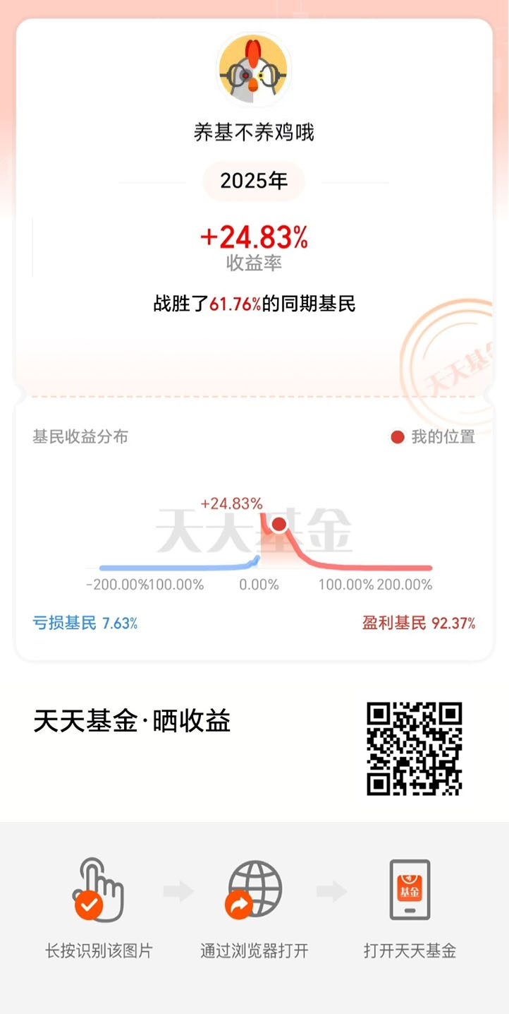 复盘2025年,我投资基金的整体收益率为24.83%,我的超额关键词是“继续努力”。收益虽然跑赢了沪深300指数,但是我觉得并不理想,可能是看到其他大佬太牛了,有点羡慕啊。(自选图在文末哦)