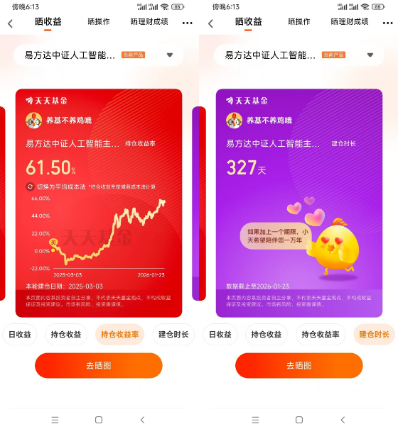 去年3月我买入了易方达中证人工智能主题ETF联接C(012734),目前持基收益率达到了61.50%,即便去掉26年1月份的涨幅,去年此基仍然为我取得了50%左右的收益,算是去年较为成功的单次投资了。
