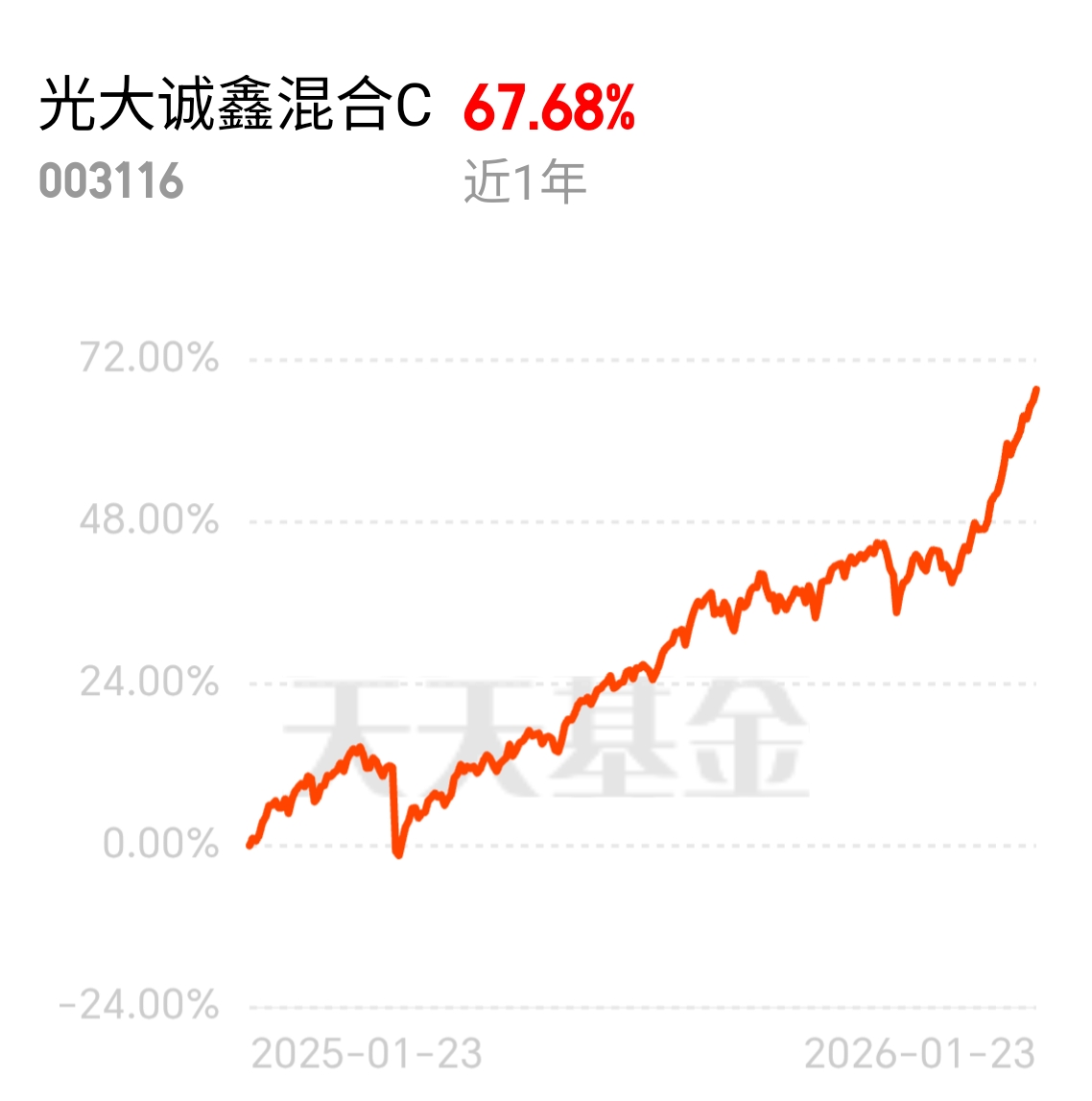 不少投资者都在找稳健又有收益的基金,光大诚鑫混合C值得关注,近1年收益67.68
