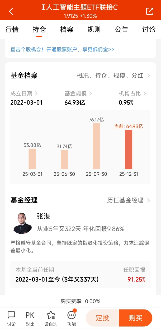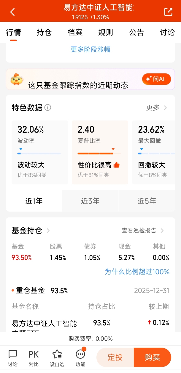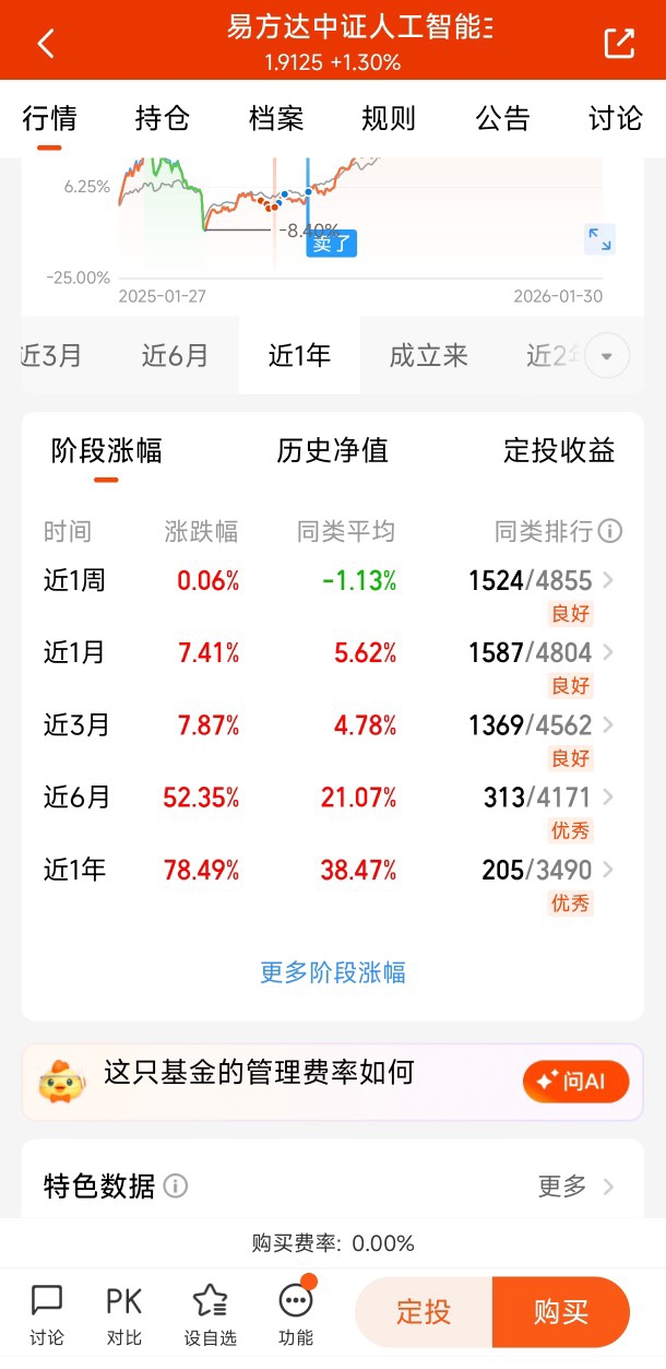 当时这只基金的净值是1.05元左右。我像极了初次约会的小伙子,小心翼翼地分批买入,生怕惊动了市场这位“心上人”。每次买入后,我都会得意地哼着小曲:“AI呀AI,你是我心中最美的云彩~”