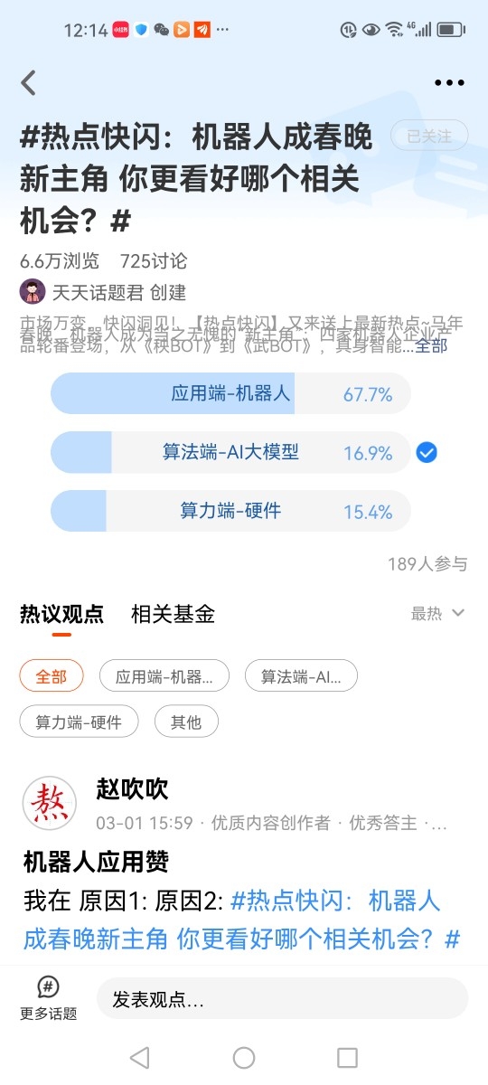 我在#热点快闪:机器人成春晚新主角 你更看好哪个相关机会?# 选择了“算法端-AI大模型”。2026年的央视春晚,AI正式从幕后走向台前,越来越多的科技变革,从过去的畅想走进现实。从水墨奔马在春晚舞台上驰骋,到国产具身机器人登台,再到十二花神降凡,春晚用科技手段为文化注入新活力,展示了时代面貌。据豆包的数据,除夕当天豆包AI互动总数达19亿。除夕当天,火山引擎豆包大模型的峰值TPM推理量达到633亿Tokens。今年春节前后国内外厂商密集推出升级产品,字节跳动Seedance2.0解决AI视频行业痛点,智谱GLM-5在逻辑推理、多模态交互等领域持续突破,OpenAI、谷歌同步迭代核心模型,验证了AI从单点技术向全域重构的跨越。从国内市场来看,AI短剧、AI营销等应用已实现规模化爆发,2026年多款AI创作工具迎来付费用户激增,产业红利加速释放。