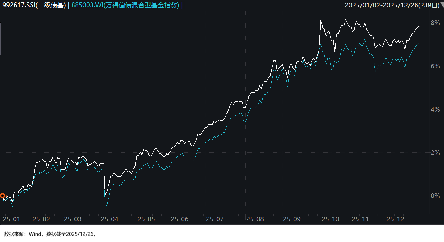 这一点我们从两个典型的“固收+”产品指数——偏债混合基金指数和二级债基就能看出来: