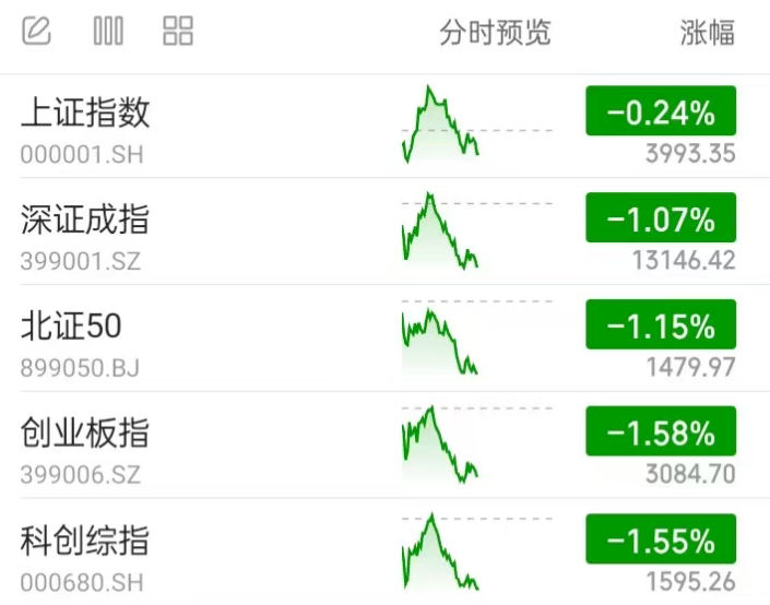 A股行情:截至中午,全市场各主流宽基指数全线调整。