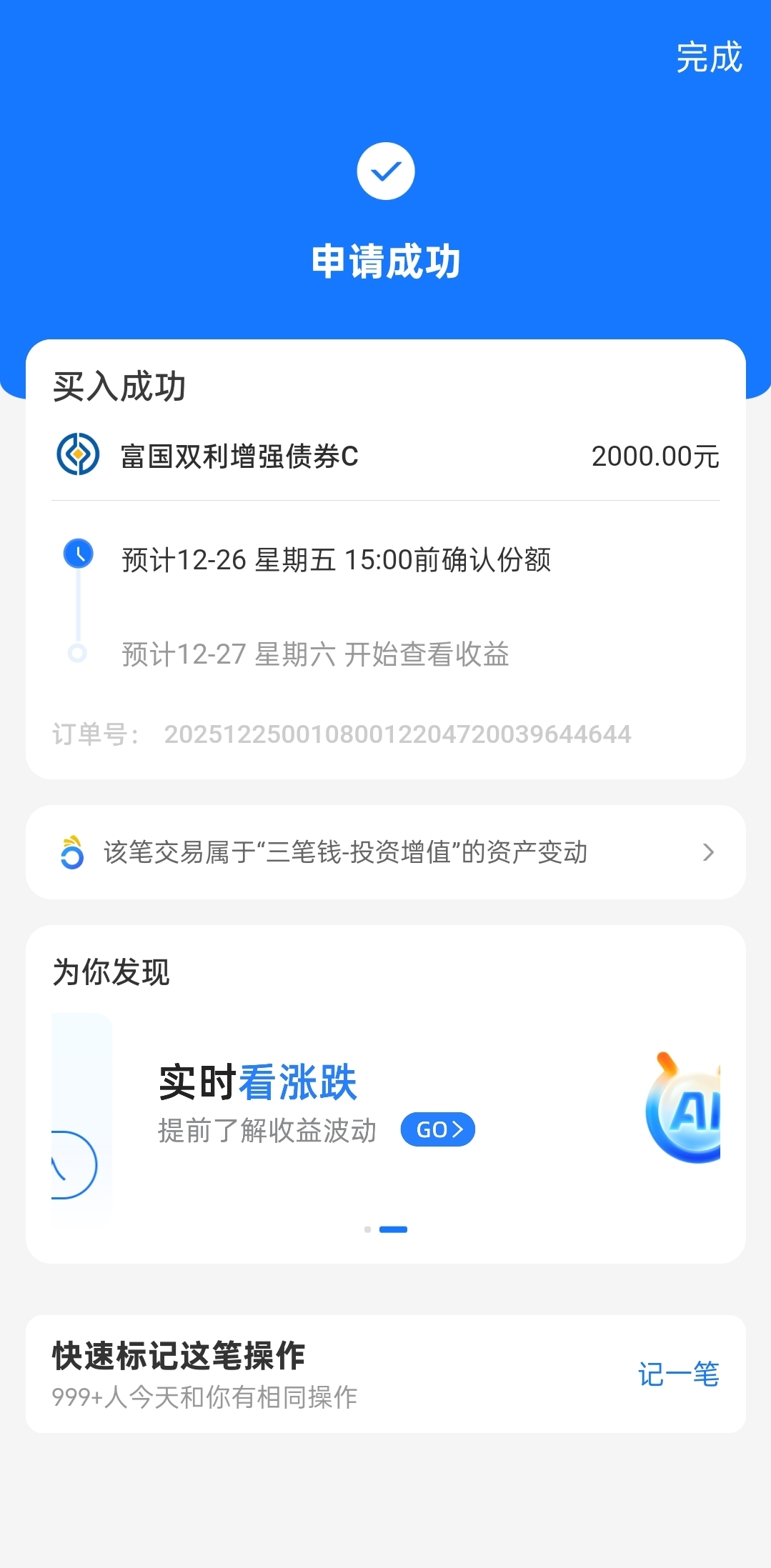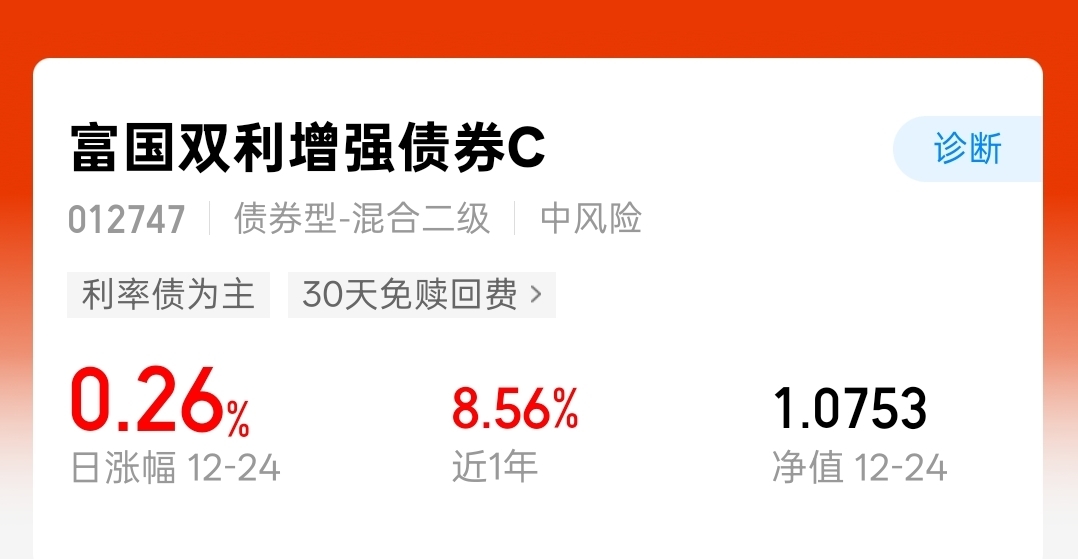最近市场还是偏向震荡的,所以我最近关注的$富国双利增强债券C$ 这种固收+产品比较多,昨天也是涨了0.26%,近一年的收益已经稳健攀升到8.56%了,总体来看表现是很不错的,年末了我更想追求资金的平稳,而它的长期业绩稳健,就适合追求“稳稳的幸福”、规避股市风险,作为资产配置中的“压舱石”再合适不过。