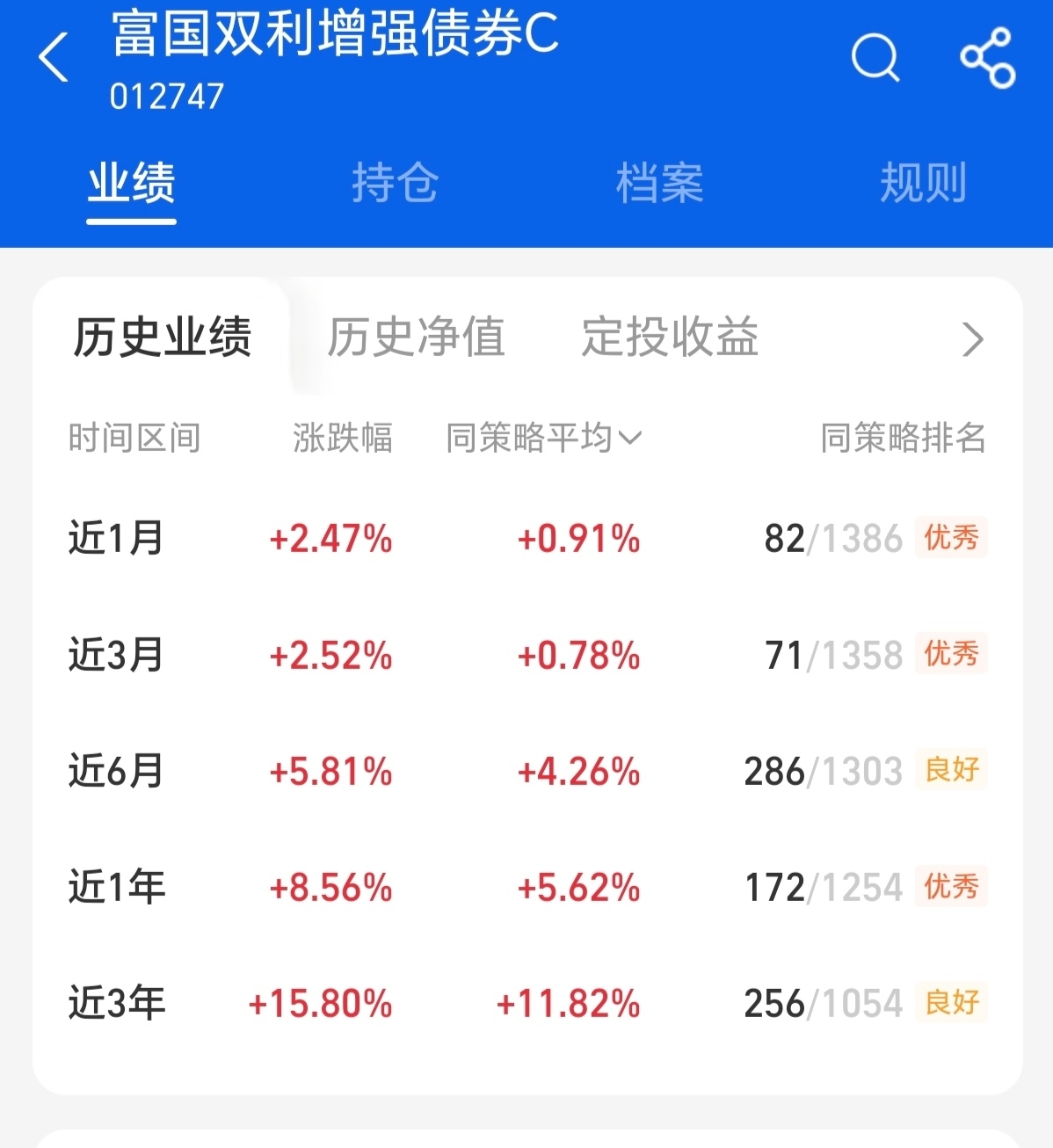 当前债市中利率债成交量偏小,整体在零轴附近震荡,中长端债券虽有下跌但跌幅有限,信用债也和昨日情况相近,波动幅度都不大,利率债整体呈现多云的状态。权益市场持续回暖,混债富国双利增强债券C$富国双利增强债券C$ 最近表现给力,昨天收26个蛋,近1年涨8.56%、近3年涨15.80%,近1月、3月、6月涨幅均超过同策略平均,利率债持仓占比63.36%,是债券持仓里占比最高的部分,信用债和可转债分别占11.16%、9.85%,还有7.63%的前10大重仓股占比,持仓涉及贵金属、半导体等多个领域。债券打底稳收益,股部分可以获得慢牛的红利,短期长期业绩都不错,继续看好。