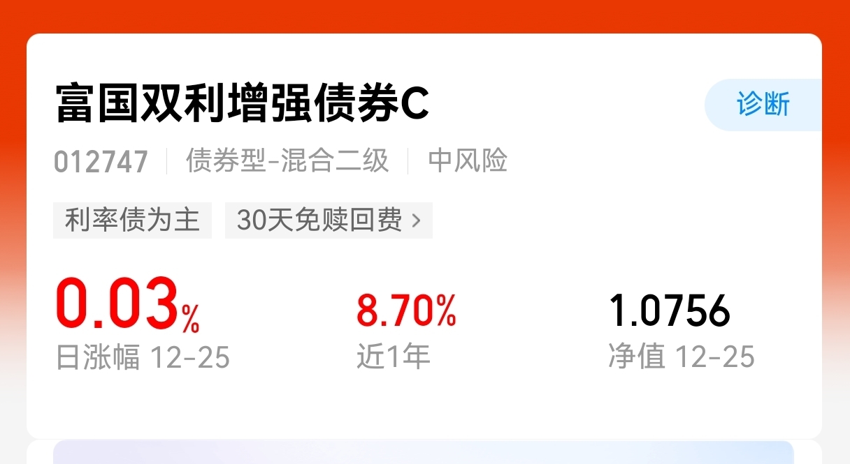 还有几天就是元旦了,时间过得真快,临近过年,安稳一些比较好,固收+其实就挺好的选择,攻守兼备,波动不会太大,近期$富国双利增强债券C$ 表现就很出色,近一周收蛋122个,近一个月收蛋217个,近六个月收蛋561个,下蛋能力强,在低利率环境下,固收打底、权益增强的固收+产品成为理财主流,放这里存钱业绩确实不错,今日上车1000。