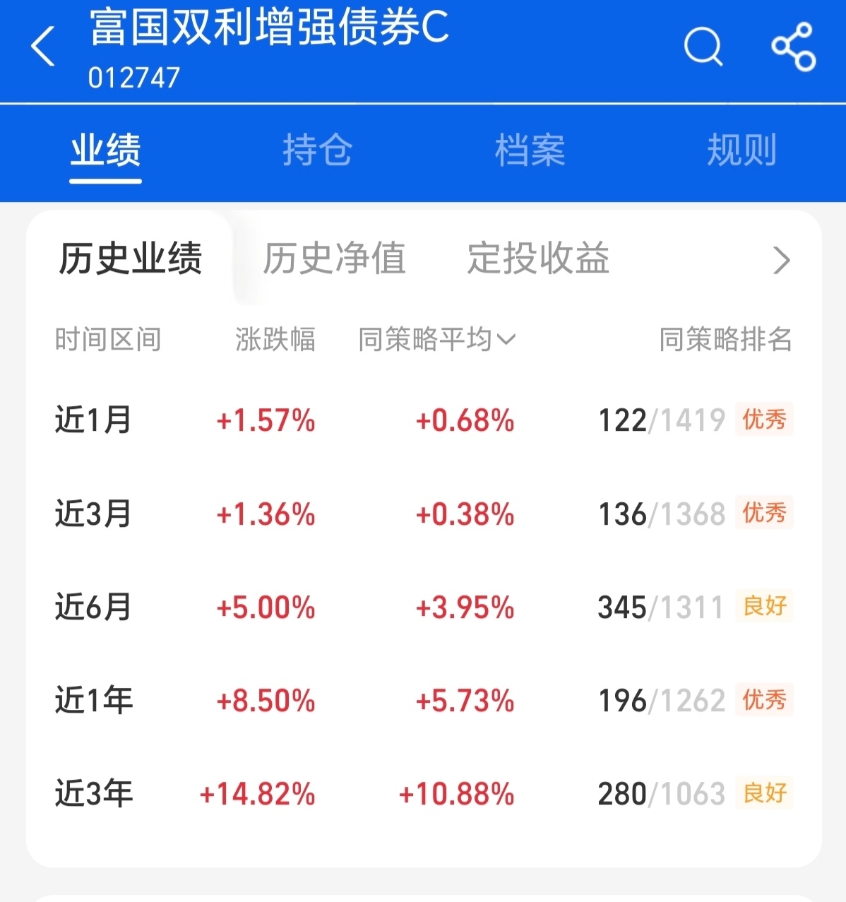 今天股市迎来开门红,目债市前10年期国债活跃券收益率上行1BP左右,基本上抹平了债市周日的涨幅,10年国开债相对好一点。信用债和同业存单盘面还是不错的,均为多云,利率债雨天,权益市场开门回暖,混债行情不错,$富国双利增强债券C$ $富国双利增强债券C$ 最近表现可圈可点,它持仓以债打底,稳收益,股部分获得超额收益,在慢牛行情下,可以分享更多红利,近一月收157个,近一年收850个,成绩优秀,继续看好。