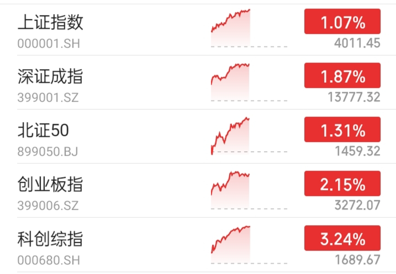 A股行情:截至中午,A股主要指数全线上涨,其中科创综指涨逾3%