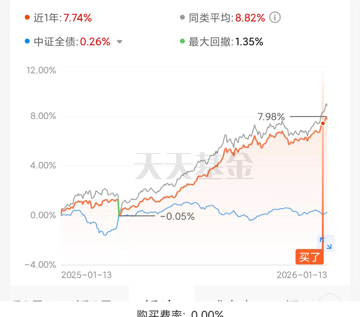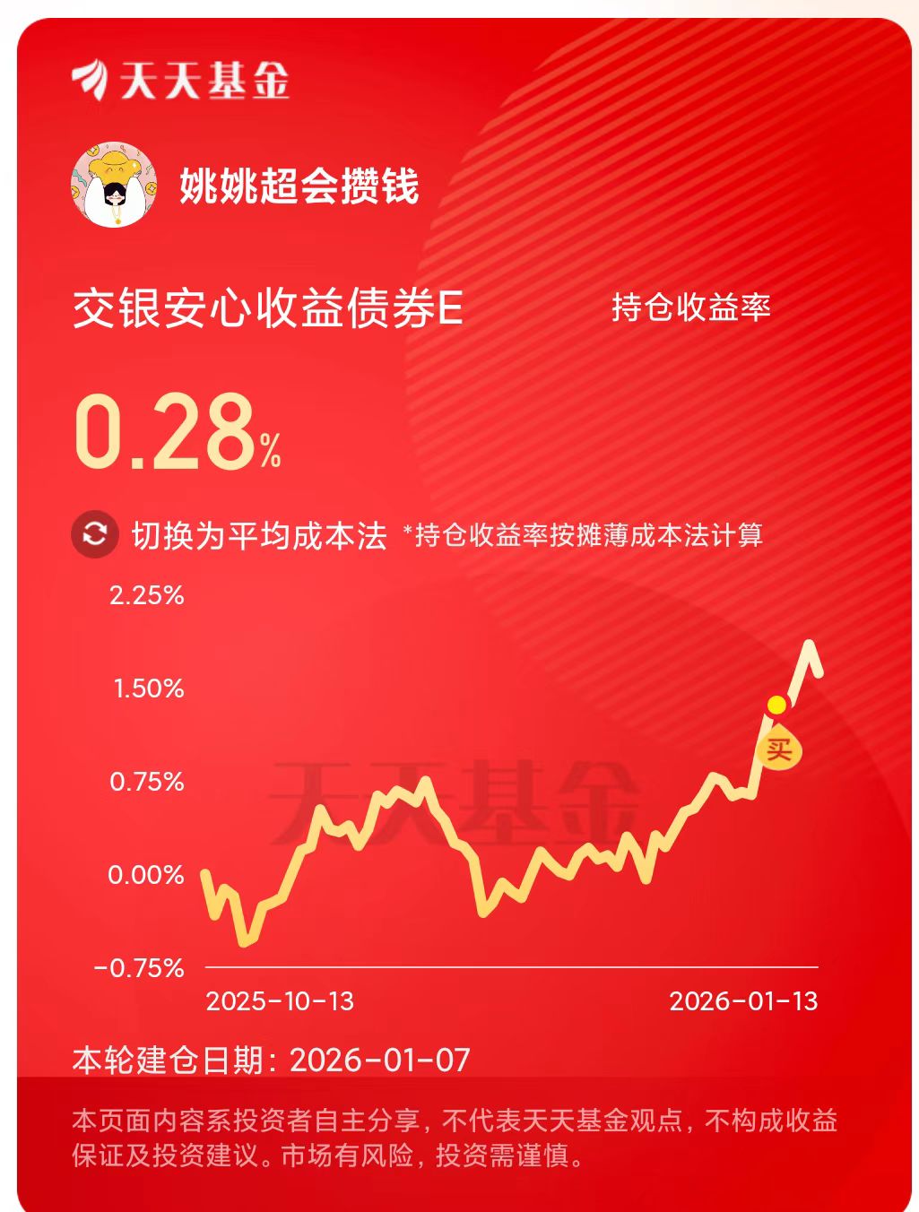 姚姚今天继续定投1000元攻守兼备的低波固收+$交银安心收益债券E(OTCFUND|019268)$,7个交易日就连涨6天,而且作为低波固收+还能爆蛋超20-30个,又稳又强!近1年涨幅7.74%,近1个月收益1.32%,长期短期业绩都是稳稳的很安心!关键近一年内最大回撤仅1.35%,远小于超长债华子、方正等等的,同时修复速度还极快,风险收益比极佳,而且通过走势图可以看出近期修复势头很猛;夏普比率2.32更是优于85% 的产品,性价比直接拉满。