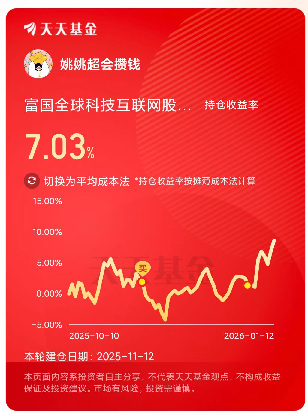 姚姚低位埋伏的$富国全球科技互联网股票(QDII)C(OTCFUND|022184)$,已经有了7%的利润,其踩中了全球科技的黄金赛道,它主攻美股优质科技核心资产,同时精准配置部分中概股,一手抓美股科技主线,一手蹭中概回升红利,当下中国资产被全球疯抢+AI巨头联手,姚姚不想全押注在A股,需要均衡布局,今儿加仓1000元!