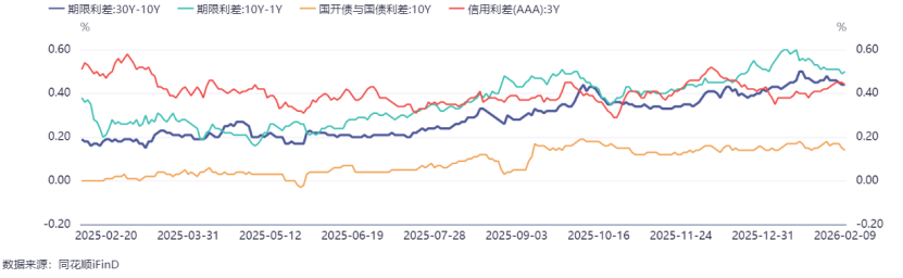 债市今天维持震荡偏暖,目前十年期国债活跃券收益率小幅下行。利率债和国债期货涨跌有所分化,长端表现较好,信用债大面积翻红,局部仍有回调,存单收益率则是多数上行。整体来看,债市今天还是延续温和修复的格局。期限利差10Y-1Y有所反弹。