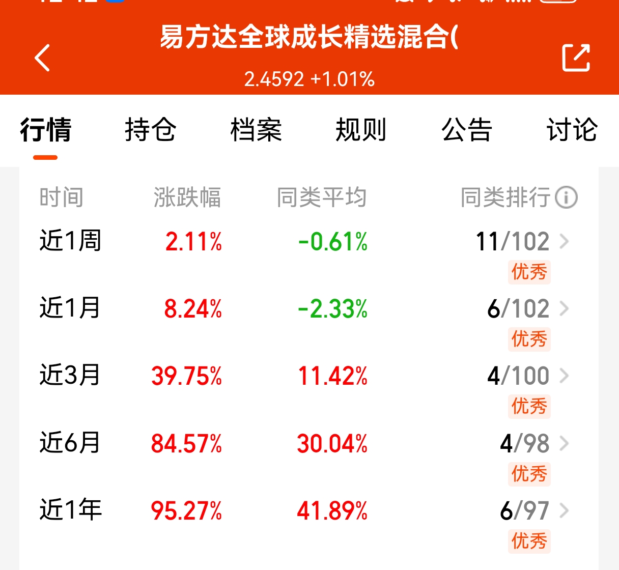 科技行情依然值得期待,今年科技还是很强的,涨多跌少,今年科技赛道持续爆发,AI算力竞赛、新能源转型与数字消费升级形成三重增长引擎,科技目前依然是主线,全方位布局为好,现在全球投资就挺不错的,不会太过于单一,在全球资产配置需求日益增长的当下,易方达全球成长精选混合C依然值得配置。