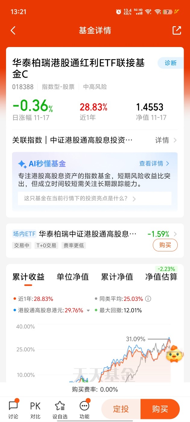 最近市场起伏太大,一会儿涨一会儿跌,手里的持仓跟着坐过山车,真怕之前赚的钱又吐回去。四季度想求稳的话,港股红利绝对是好选择,今天它又展现了抗跌优势,资金都在往这个方向跑。毕竟红利股都是现金流稳、分红实在的企业,不容易受大行情影响。普通人想布局的话,华泰柏瑞特别靠谱,不用自己选股,直接打包港股通里的优质红利标的,操作简单,持有成本低,帮你稳稳守住今年的收益成果。#今年买基金赚了多少钱?# $华泰柏瑞港股通红利ETF联接基金C$