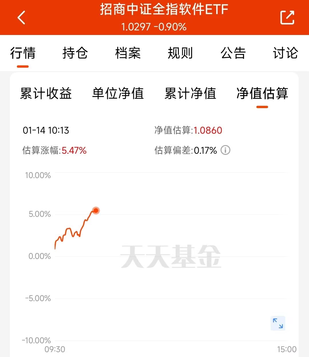 市场从大涨转向下跌,起初热情很足,跌下去就有人接盘,情绪没法快速降温,就像高速行车踩了刹车,还会往前滑行,只是速度变慢了。$招商中证全指软件ETF发起式联接C(OTCFUND|018386)$估值涨了 4.63%,把行业里的核心科技标的都收了进来,近一个月涨幅更是冲到 29.35%,完全是牛市的感觉。前期加仓太少,现在后悔也没用,不等了!