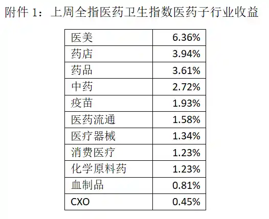 上周医药受流感数据上升和创新药基本面信息催化,在泛红利和创新药制剂方向均有较好涨幅。从细分子行业看,医美、药店、药品、中药等跑赢全指医药卫生指数。
