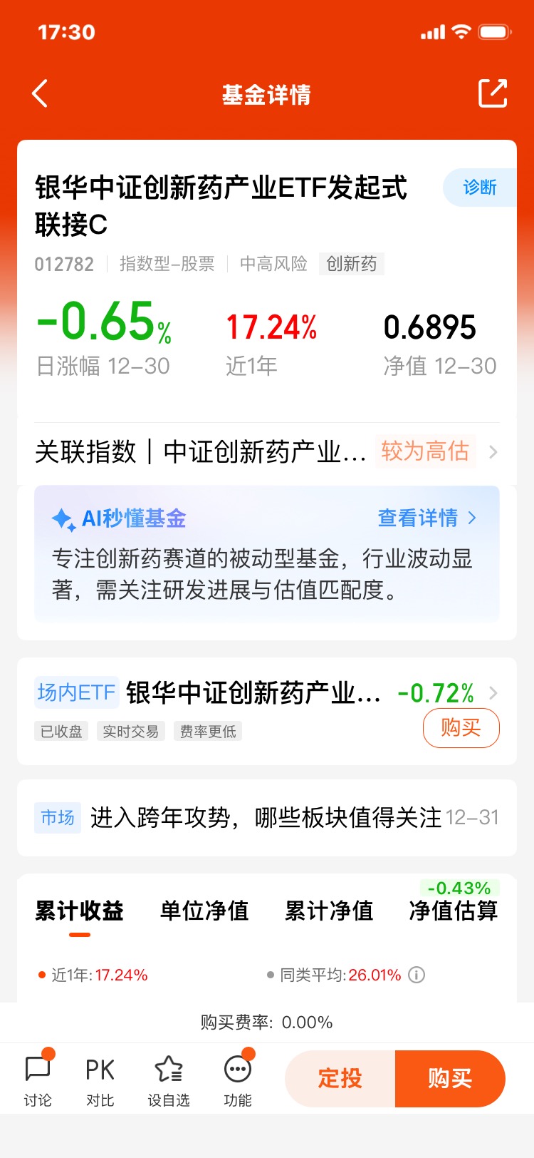 第三,工具属性强,操作灵活。 以ETF联接基金为代表的指数产品,费率通常较低,交易便捷(像$银华中证创新药产业ETF发起式联接C$这类C份额,通常持有满一定期限免赎回费,更适合波段或定投操作),透明度高(紧密跟踪指数,持仓一目了然)。这为我们提供了非常好的工具:当我们看好创新药板块整体行情时,可以便捷地一次性布局;在市场震荡时,可以采用定投的方式平滑成本、积攒份额;甚至可以利用其做一定的行业轮动配置。它把复杂的个股选择简化为对行业趋势的判断,大大降低了参与门槛。