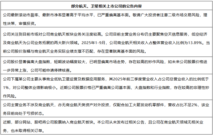经过连续十七个交易日的上涨后,今日上证指数出现调整。其中近期表现活跃的卫星导航、商业航天等相关板块回调较为明显。此次调整的直接诱因,可能与相关板块短期涨幅较大、相关公司提示风险有关,昨天晚间,多家上市公司陆续发布风险提示公告,澄清业务涉及范围、提示估值风险;同时,某航天领域公司遭遇控股股东减持,也对市场情绪带来一定影响。(数据来源:Wind,2025.12.17-2026.1.12)