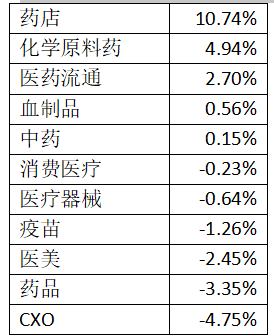 上周医药跑输大盘,在市场乐观情绪有所降温的影响下,前期强势板块有所回调,而受大盘风格影响,有化工属性和涨价预期且估值较低的化学原料药板块部分个股活跃,同样低估值的泛红利风格个股有相对收益。从医药细分子版块看,药店、化学原料药、医药流通、血制品和中药跑赢全指医药卫生指数。