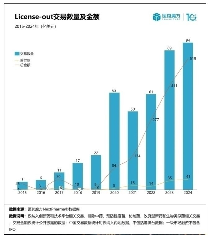 License-out(对外授权)正在重新改写产业格局,中国研发、全球变现的模式已经蔚然成风。医药魔方与清华大学联合发布的一项研究报告显示,2024年国内创新药License-out共完成94笔交易,总金额高达519亿美元,同比增长26%。截至2024年底,中国企业研发的活跃状态创新药数量累计已达3575个,超越美国成为全球*。