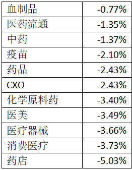 上周医药跑输大盘,从资金流向角度,继脑机接口和JPMorgan大会催化之后,市场资金更多聚集在有色金属化工等中上游板块,医药整体受资金跷跷板效应影响再次回调测试前低。从医药细分子版块看,上周医药内部整体跟随大盘风格,泛红利板块有相对收益,血制品、医药流通和中药跑赢全指医药卫生指数,疫苗板块在周中受信息影响大涨后回调,整体略跑赢医药指数。纵观整个1月份,全指医药卫生指数上涨1.5%,药店、消费医疗、CXO、化学原料药、医疗器械、医药流通跑赢全指医药卫生指数。