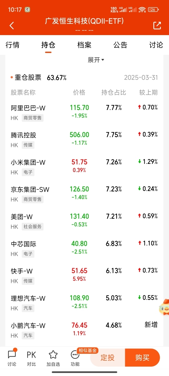 广发恒生科技ETF联接C的持仓组合,恰是这种「生活化科技」的缩影:既有腾讯、阿里等「基础设施型」企业,也有商汤-W、京东健康等「场景落地型」标的。就像我每天使用的微信支付、淘宝购物,这些企业的产品早已融入生活肌理,其现金流稳定性远高于单纯的「概念公司」。这种「科技生活化」的投资逻辑,让我在市场波动时多了份从容——2025年3月AI板块回调15%时,我定投的组合因重仓「硬科技+消费科技」,回撤控制在8%以内。