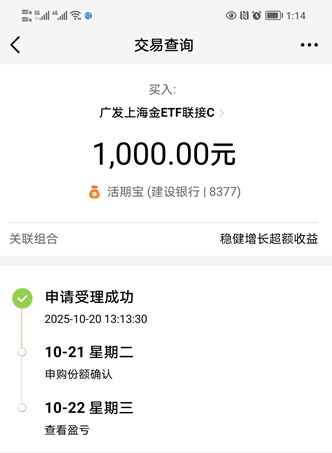 2.黄金方向:我今天继续加仓$广发上海金ETF联接C(OTCFUND|008987)$ 1000元。这支基金是上海金的ETF联接基金。近几年来,国际黄金表现稳定且优秀,本基金近3年涨133.88%,近2年涨103.94%,近1年涨60.21%,近6月涨26.00%,近3月涨28.83%,近1月涨19.51%,近1周涨10.77%,短中长各时间周期都保持线性上涨。若能够安心中长期持有,收益率估计能够轻松跑赢绝大部份投资者。纽约金上周五冲高回落,吓着了很多投资者,其实不懂才是我们恐惧的根源,当你懂了黄金上涨的核心逻辑,你就会明白,真正的上涨才刚刚开始。我认为黄金上涨有三点核心逻辑,一是全球大放水,世界局势紧张,三是比特币安全被击穿。我看好黄金接下来的表现,今天趁着上海金回大胆加仓本基金。下面我晒一下买入操作记录: