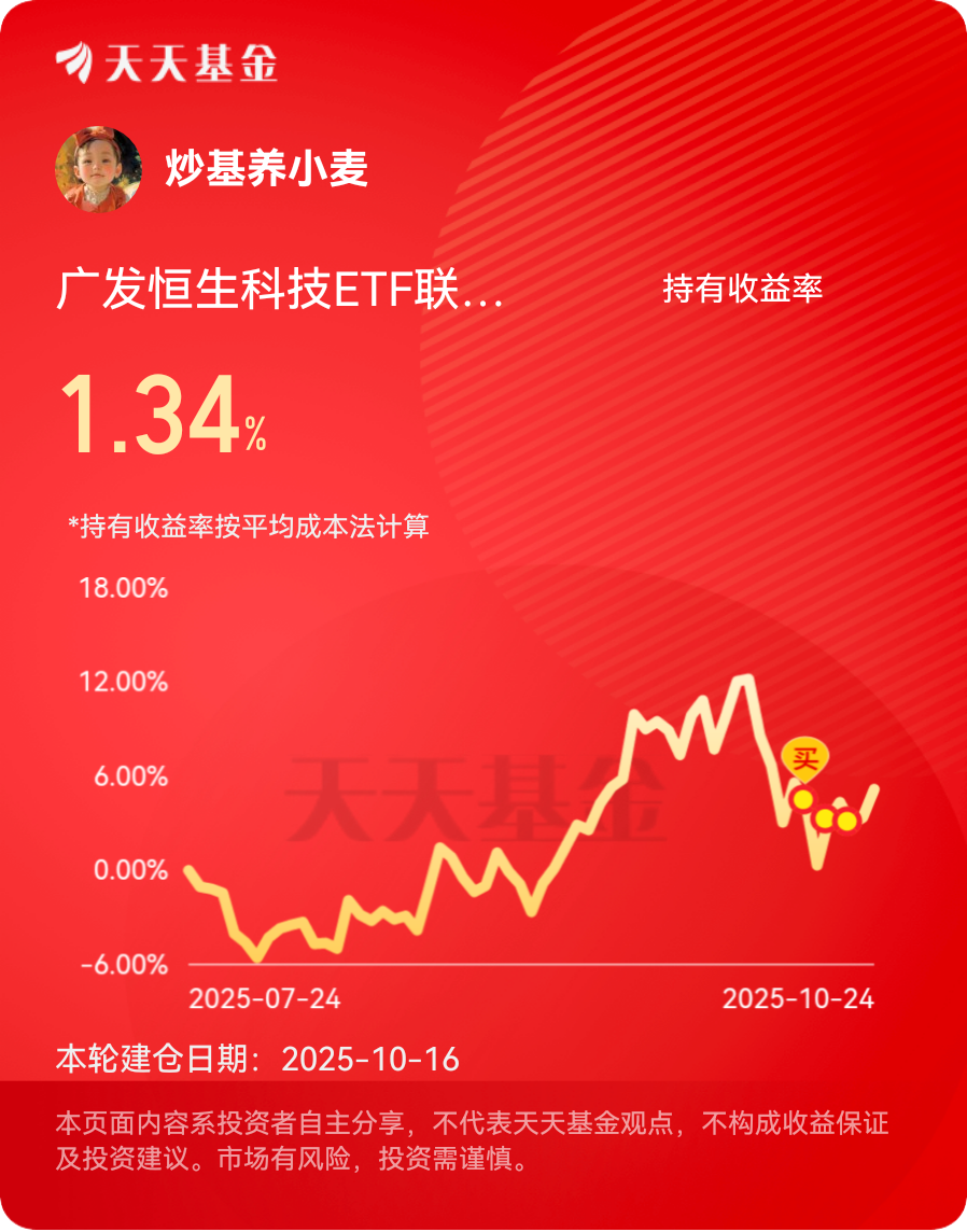 #晒收益# 今天 A 股和港股都挺给力呀,咱们持有的广发恒生科技 ETF 联接(QDII)C(012805)也涨了 1.75%,麦爸的收益终于变红啦,达到了 1.34%,真是让人开心呀!