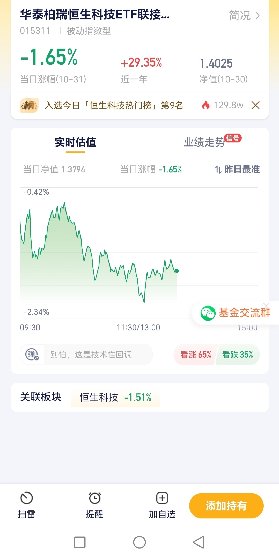 今日恒生科技板块回调1.51%,华泰柏瑞也跌了1.65%。但你看它近一年涨了快3