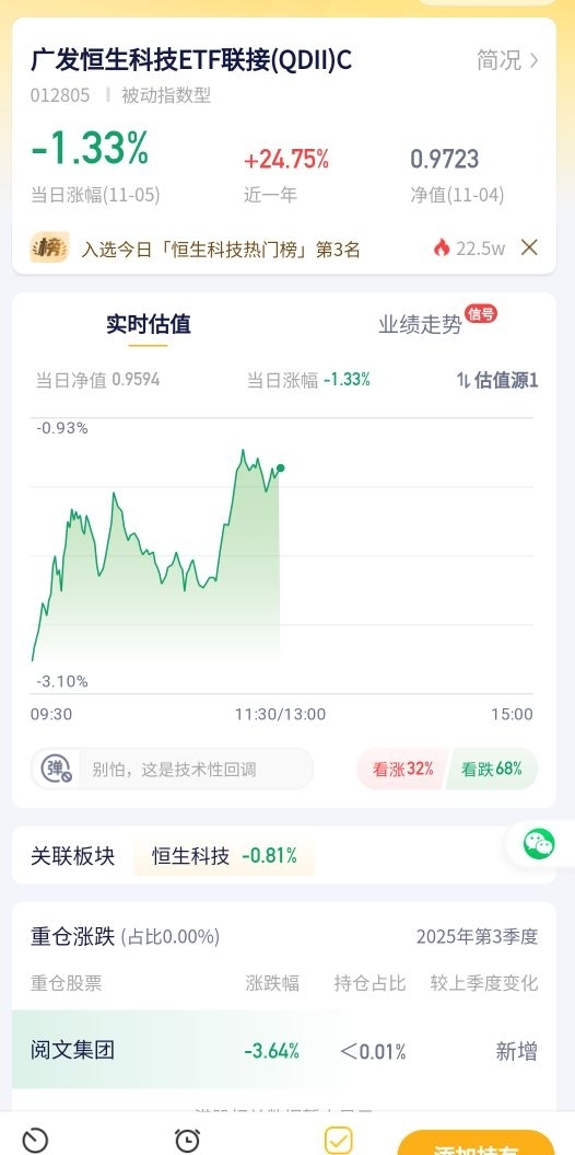 谁能想到今天恒生科技又跌了?盘中一度跌超2%,亚洲其他市场也跟着跌,看得人有点懵 。不过仔细扒拉消息就知道,主要是市场担心AI估值太高,加上美股传导过来的压力,并不是板块本身出了问题。反而现在估值到了历史低位,中长期来看是机会大于风险。这种时候布局得选老牌靠谱的,华泰柏瑞可是首批做ETF的,打造过不少规模超大的产品,实力摆在那 。建议别瞎补,但像华泰柏瑞这种优质的,可以按节奏来,跌的时候补一点,别把子弹一次打光,稳着来更踏实。$华泰柏瑞恒生科技ETF联接(QDII)C$
