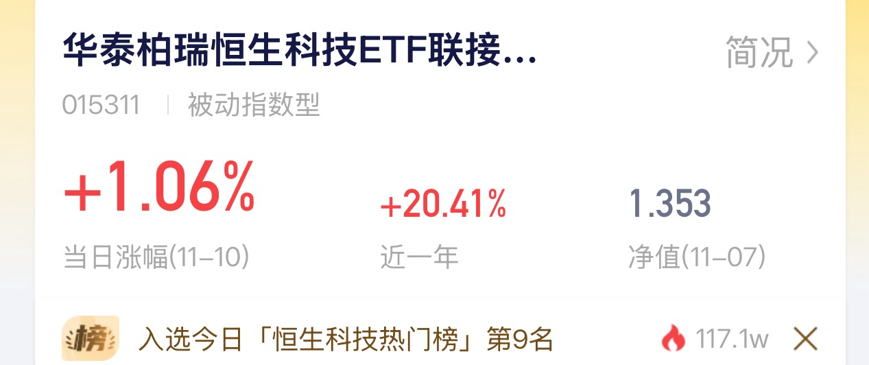 说说恒生科技,最近这价格确实让人心动。美国政府重新开门,算是扫除了一个不小的障碍,港股企稳的可能性在增加。对于咱们小散来说,直接买港股不容易,借道基金是个聪明办法。我关注到华泰柏瑞这只联接基金就很方便,在自家平台就能申购赎回,资金效率高,没有QDII额度限制的烦恼,算是低成本投资港股科技板块的一个“直通车”了。