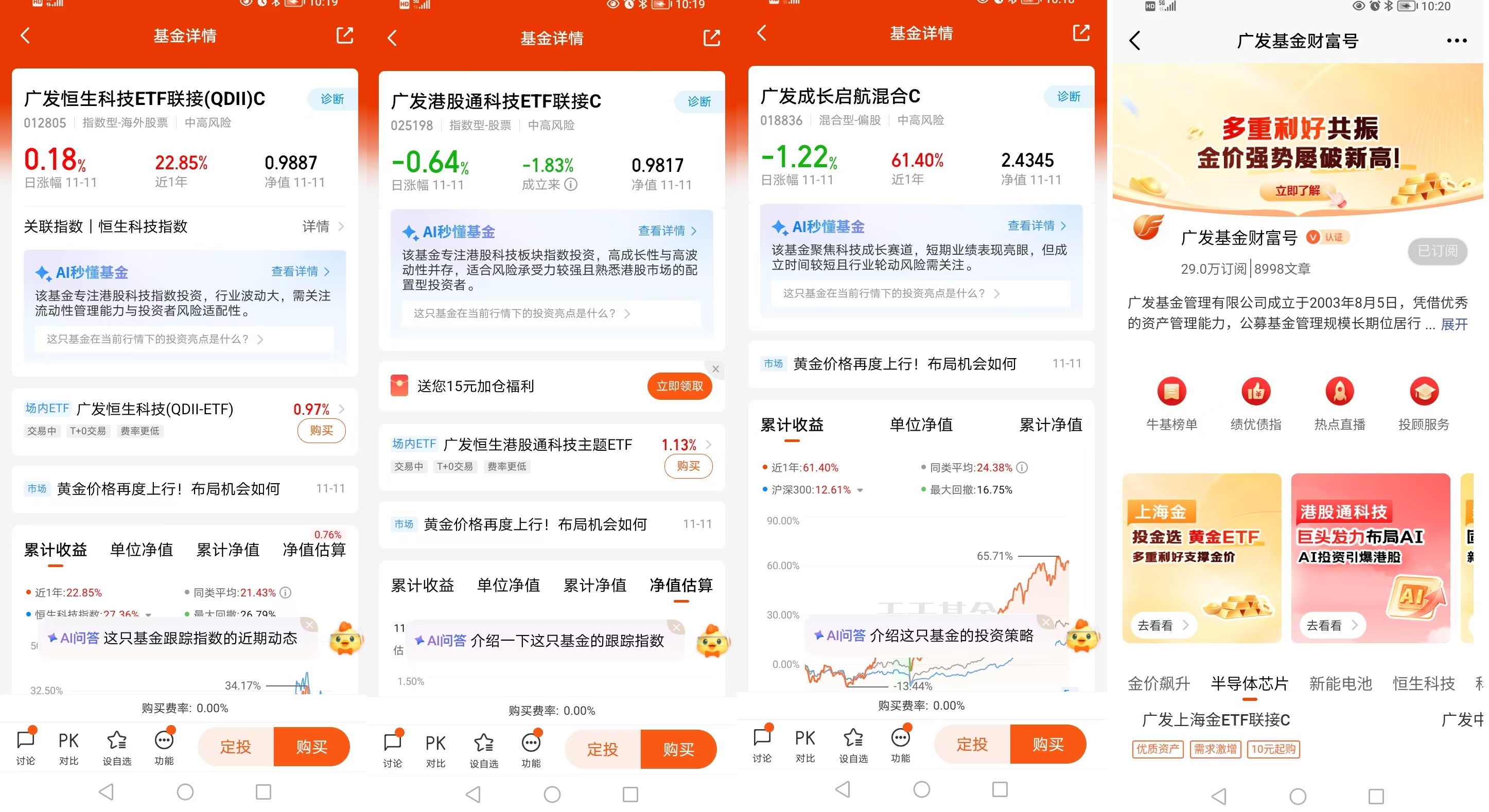 广发成长启航混合C(018836)、广发恒生科技ETF联接(QDII)C(012805)、广发港股通科技ETF联接C(025198),以差异化布局构建投资组合。