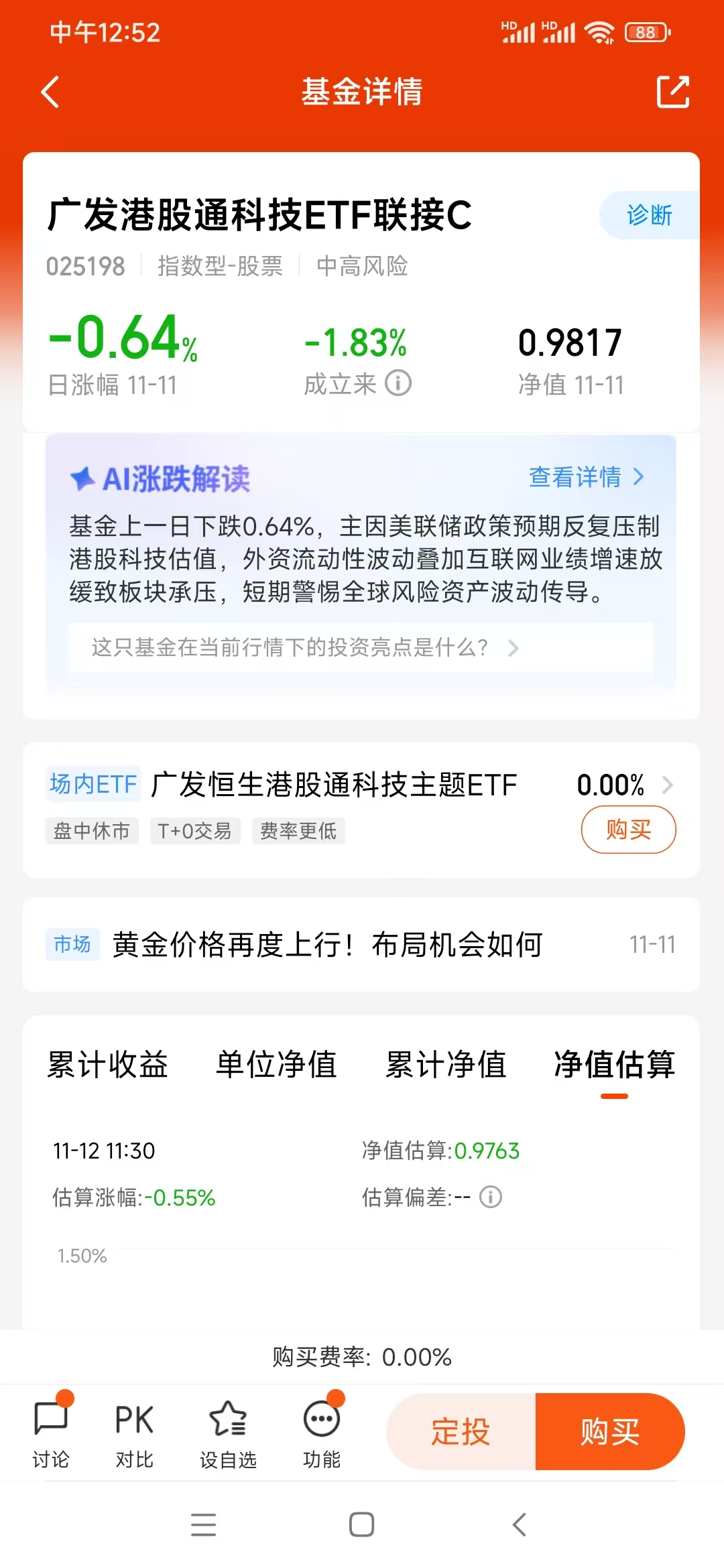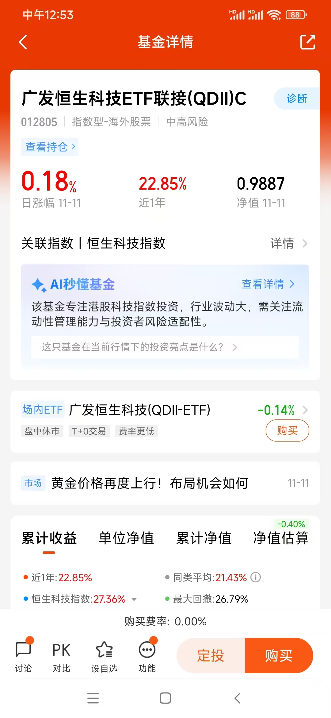我自己是在9月下旬加仓了广发恒生科技ETF联接(QDII)C(012805),在十一假期结束后,无论A股还是港股的科技板块都迎来了调整,先说清楚,我自己认为短期波动真的不值得大惊小怪。对上班族来说,投资基金本来就该用闲钱,我加仓的资金都是短期内用不到的,5.63%的回撤完全在我的风险承受范围内。而且比起这只基金近一年22.85%的涨幅,这点短期波动就像大海里的小浪花,根本影响不了长期收益趋势。